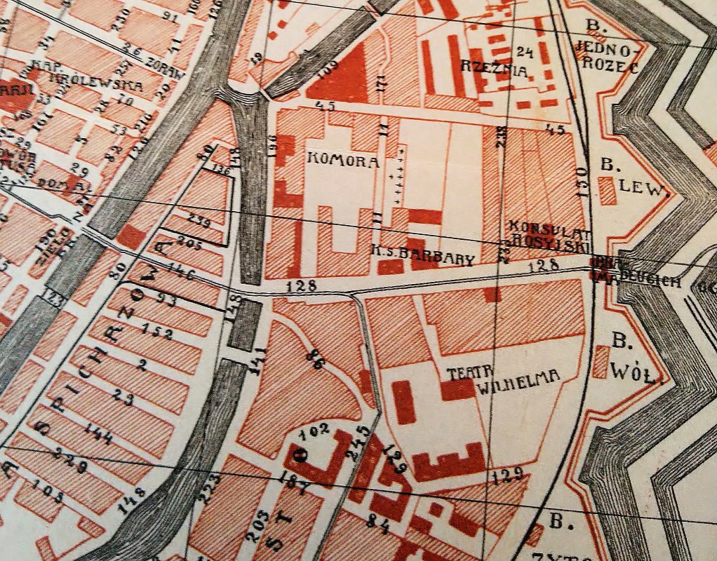 Після Другої світової війни на місці знаменитого “Театру Вільгельма” збудували новий житловий масив з багатоповерхівками та гаражними будовами на вулиці Длугі Огроди 22 і 24.